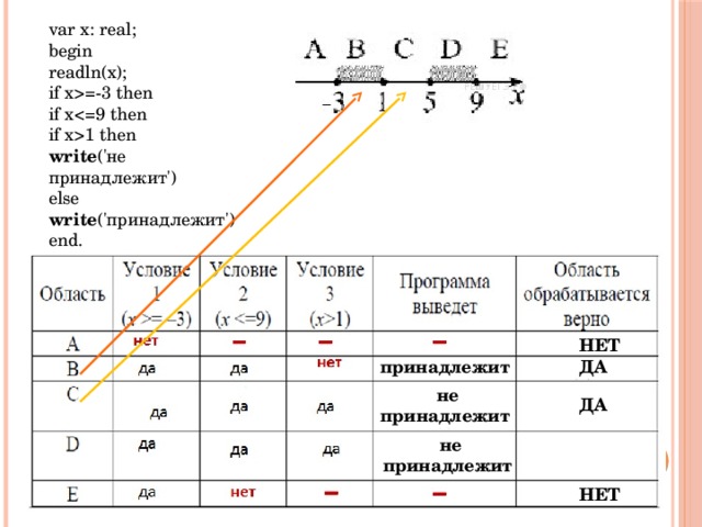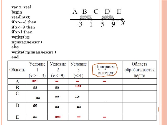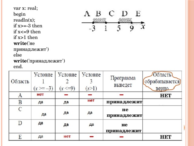 =-3 then if x1 then write ('не принадлежит') else write ('принадлежит') end. НЕТ принадлежит ДА не принадлежит ДА не принадлежит НЕТ " width="640"