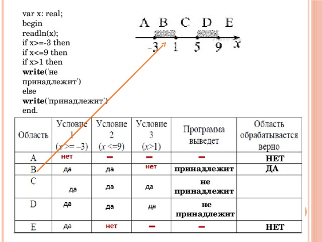 =-3 then if x1 then write ('не принадлежит') else write ('принадлежит') end. НЕТ принадлежит ДА не принадлежит не принадлежит НЕТ " width="640"