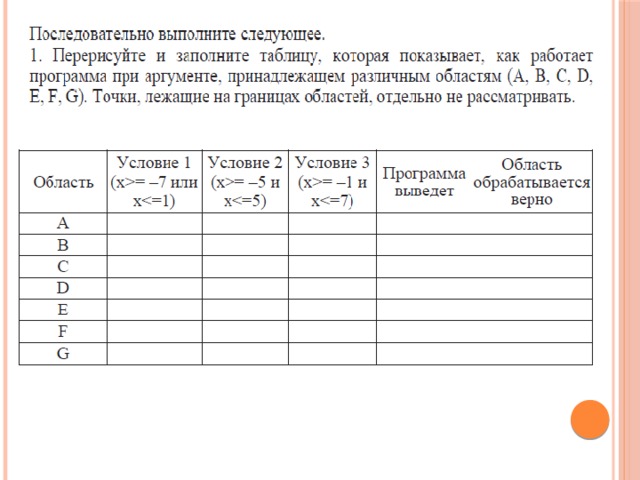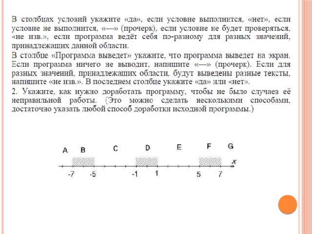 В столбцах условий укажите «Да», если условие выполнится; «Нет», если условие не выполнится; «—» (прочерк), если условие не будет проверяться; «не изв.», если программа ведет себя по-разному для разных значений, принадлежащих данной области. В столбце «Программа выведет» укажите, что программа выведет на экран. Если программа ничего не выводит, напишите «—» (прочерк). Если для разных значений, принадлежащих области, будут выведены разные тексты, напишите «не изв.». В последнем столбце укажите «Да» или «Нет».