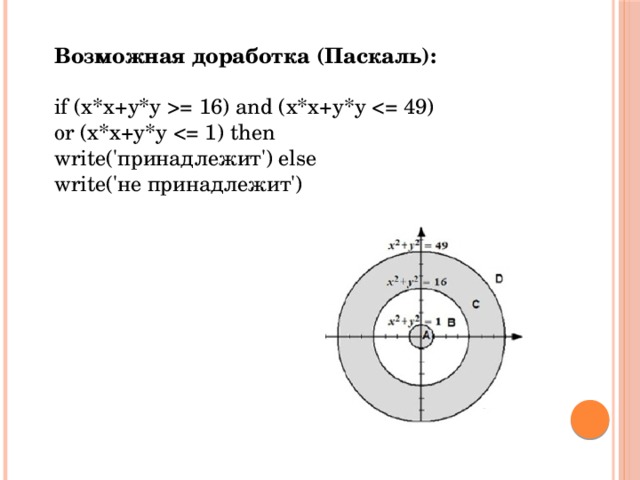 Возможная доработка (Паскаль): if (х*х+у*у = 16) and (х*х+у*у