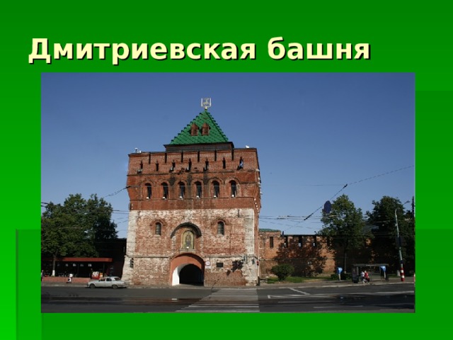 Дмитриевская башня по своему положению занимает ведущее место в Нижегородском кремле и главенствующее на его нагорном участке. Она расположена в центре нагорного участка и выходит фасадом на расширенную в виде полукруга часть площади Минина и Пожарского.