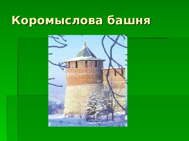 Коромыслова башня - круглая, расположена на крутом повороте кремлевской стены над пересечением Зеленского съезда ( "трубы" ) с Почаинским оврагом. Да и сама башня с примыкающими пряслами напоминает, если смотреть с противоположного берега Почаинского оврага, крепкую молодуху с коромыслами на плечах. Не потому ли и башня называется Коромысловой.