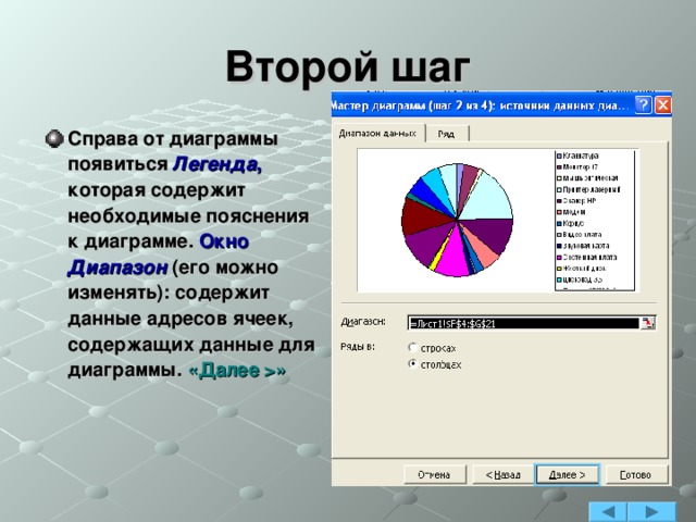- Справа от диаграммы появиться Легенда , которая содержит необходимые пояснения к диаграмме. Окно Диапазон (его можно изменять): содержит данные адресов ячеек, содержащих данные для диаграммы. «Далее »