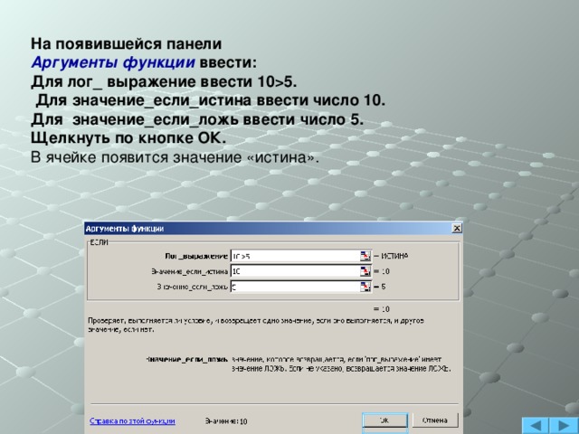 5. Для значение_если_истина ввести число 10. Для значение_если_ложь ввести число 5. Щелкнуть по кнопке ОК. В ячейке появится значение «истина». " width="640"