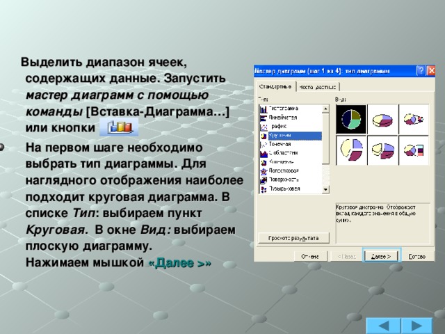 - На первом шаге необходимо выбрать тип диаграммы. Для наглядного отображения наиболее подходит круговая диаграмма. В списке Тип : выбираем пункт Круговая. В окне Вид: выбираем плоскую диаграмму. Нажимаем мышкой «Далее »