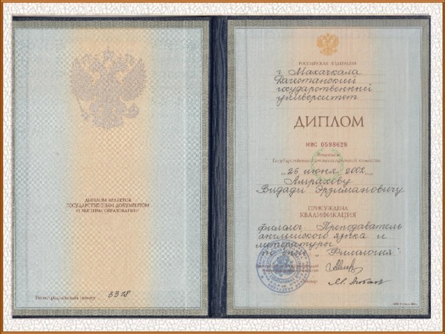 - Образование: Дагестанский государственный университет (26.06.2002 г, факультет иностранных языков)