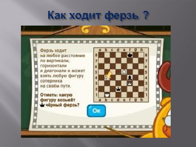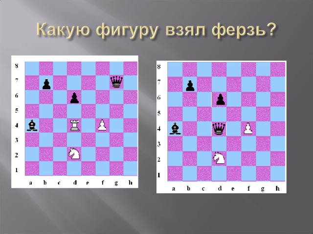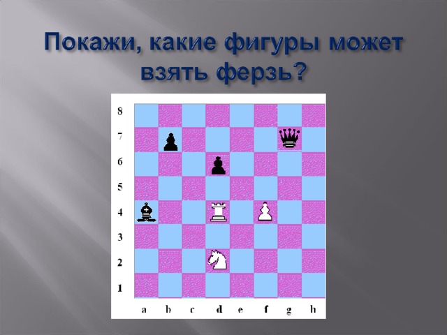 - Если встречается чужая фигура, то ферзь может её взять ( взятие!)
