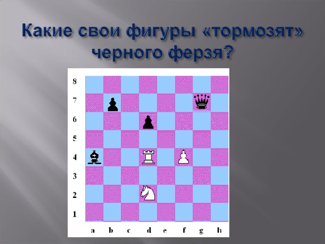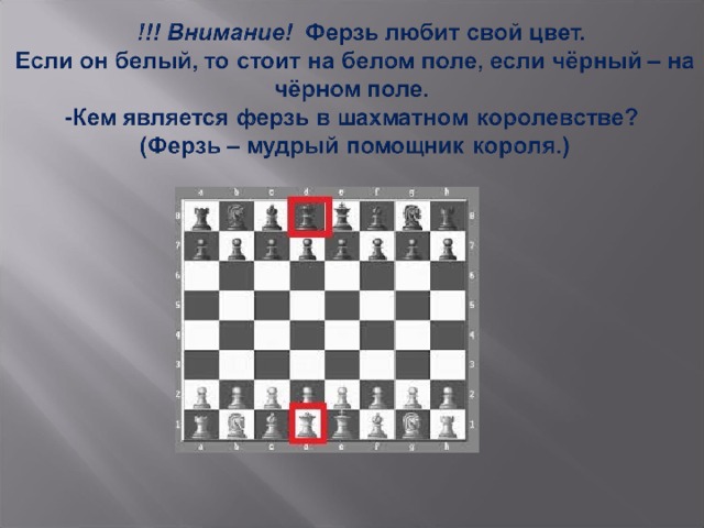 - Ферзь не перепрыгивает через другие фигуры, в том числе и через свои