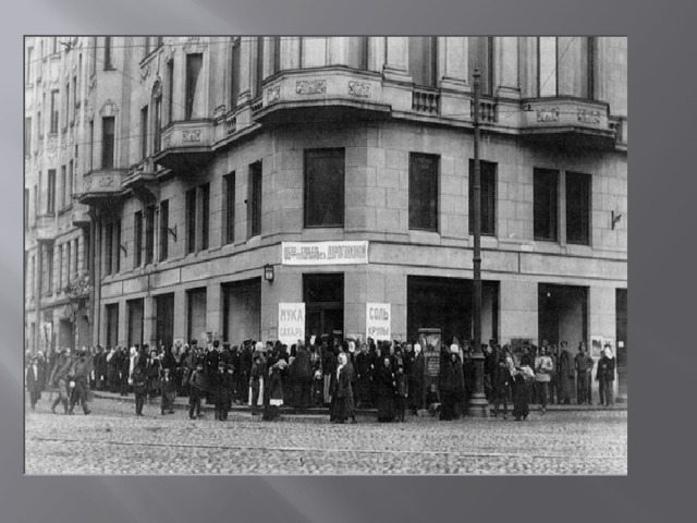 Нехватка хлеба из-за перебоев на ж/д транспорте, слухи о введении карточек и массовое увольнение 30 тыс. бастовавших рабочих на Путиловском заводе в Петрограде.