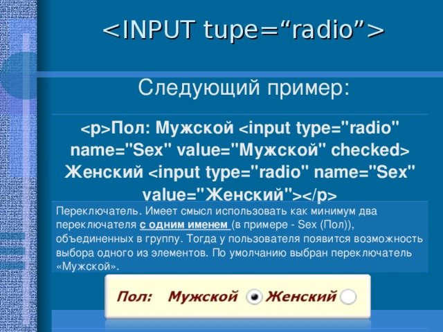 Пол: Мужской Мужской" checked Женский Женский" p Переключатель. Имеет смысл использовать как минимум два переключателя с одним именем (в примере - Sex ( Пол)), объединенных в группу. Тогда у пользователя появится возможность выбора одного из элементов. По умолчанию выбран переключатель «Мужской». " width="640"