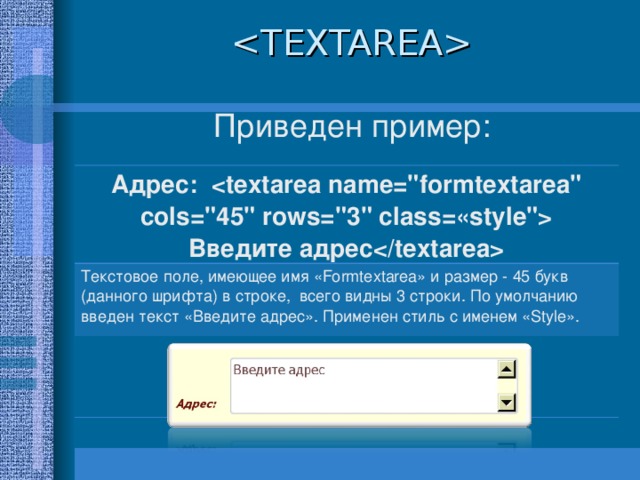 Текстовое поле, имеющее имя « Formtextarea » и размер - 45 букв (данного шрифта) в строке, всего видны 3 строки. По умолчанию введен текст «Введите адрес». Применен стиль с именем « Style ». " width="640"