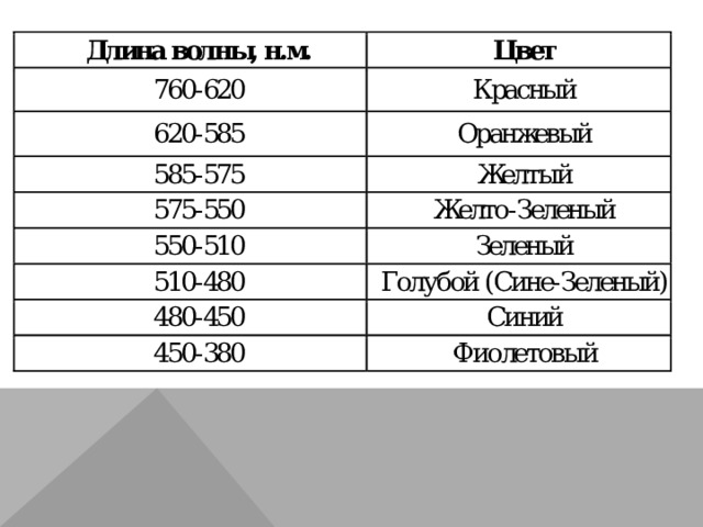 Свет - это электромагнитное волновое движение. Длины волн видимого света заключены в интервале от 380 н.м. до 760 н.м.