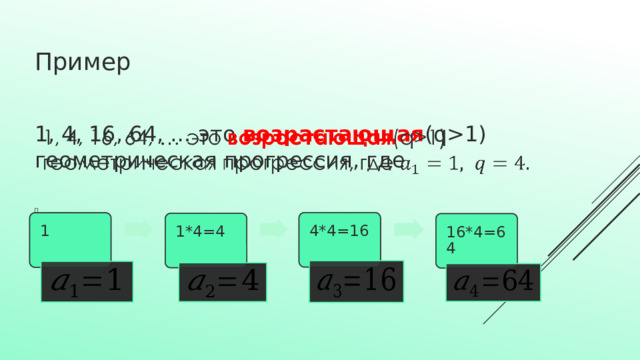 1, 4, 16, 64, … это возрастающая (q1) геометрическая прогрессия, где