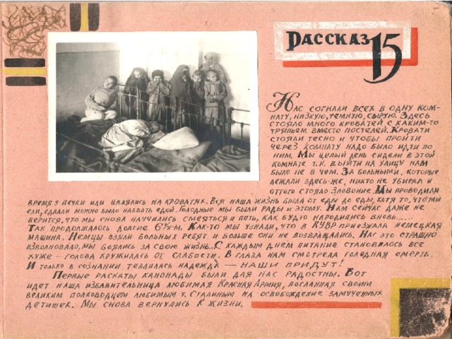 Дети, а их было 63 человека, находились в одной большой комнате. Оборванные, истощенные болезнями и голодом они лежали на кроватях с прогнувшимися сетками, на полу.