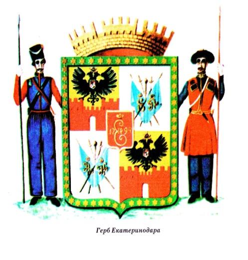 Работа над городским гербом Екатеринодара началась в 1841 году. В 1843 году художник Иван Черник представил готовый эскиз герба. Следующие семь лет он дорабатывался и уточнялся. Главная часть герба – прямоугольный, заостренный щит. Он разделен на четыре равные части. На первой и четвертой частях на золотом поле изображена крепостная стена “червленого цвета” с открытыми воротами над стеной возвышается двуглавый российский орел церного цвета с московским гербом на груди. На второй и третьей частях на серебряном поле располагались знамена с вензелями Екатерины II, Павла I, Александра I, Николая I – символами державности. Казак слева – в синей казачьей форме времен Александра I. Справа казак в красной форме, времен царствования Николая I.