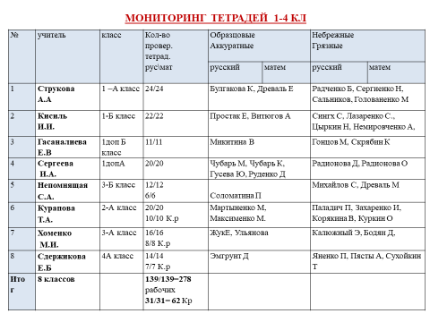 Дважды в течение года: октябрь и апрель (08.04.25 -11.04.25) года Кисиль И.И. анализировалось ведение и состояние проверки рабочих и контрольных тетрадей по русскому языку и математике в 1-4 классах.