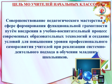 Совершенствование педагогического мастерства в сфере формирования функциональной грамотности путём внедрения в учебно-воспитательный процесс современных образовательных технологий и создание условий для повышения уровня профессионального саморазвития учителей при реализации системно-деятельного подхода в обучении младших школьников.