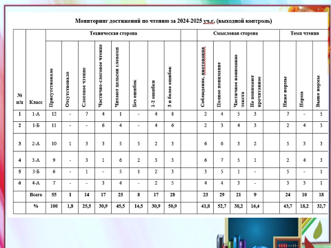 2024-2025 уч.г. наконец -то проходил в очном формате. Учебный год был активным и продуктивным во всех направлениях. После дистанционного обучения пришлось приложить много усилий, так как хромал почерк, темп чтения и письма, внимание и усидчивость детей.