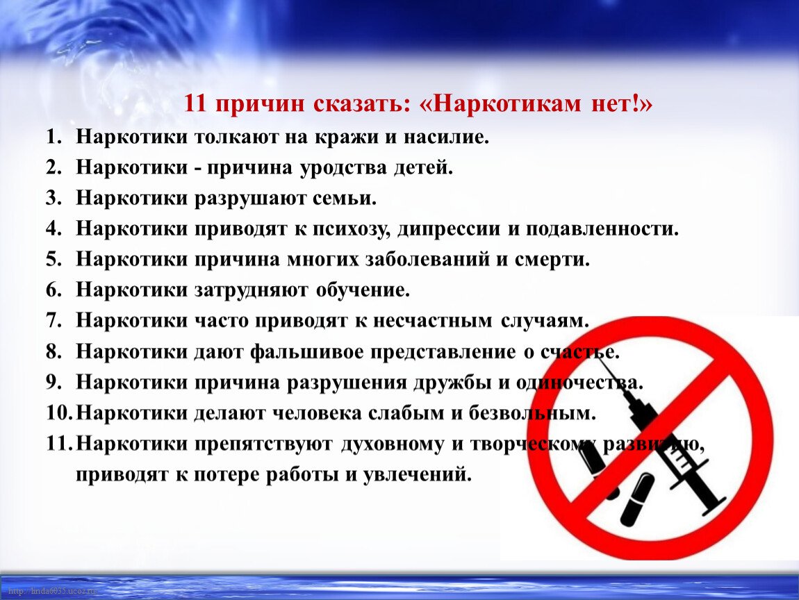 Давайте посмотрим на слайд и прочитаем 11 причин казать: «наркотикам нет!»