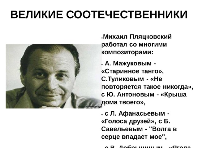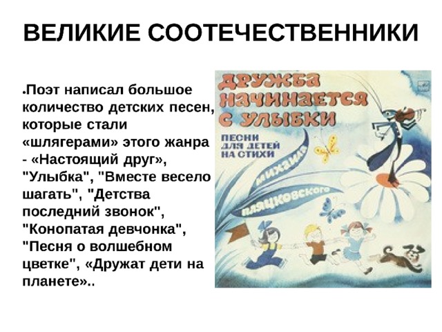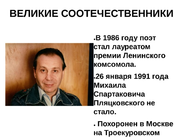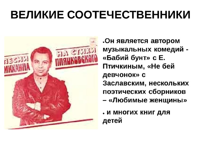 Данная презентация посвящена выдающемуся советскому поэту-песеннику Михаилу Спартаковичу Пляцковскому.