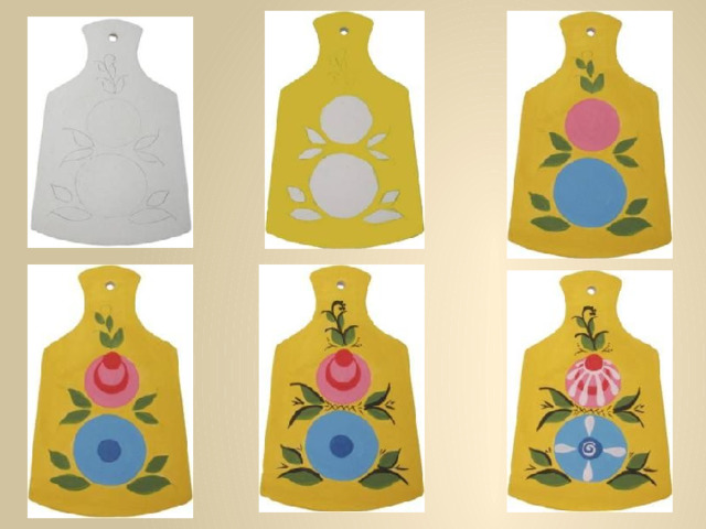 1) Нарисовать форму изделия (шаблон). 2)Выполнить роспись основного фона.