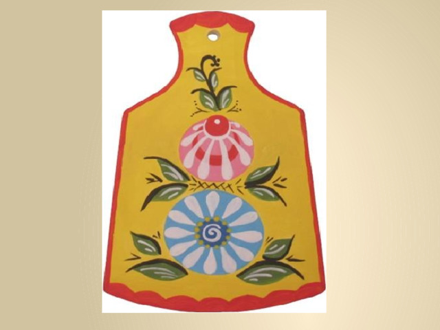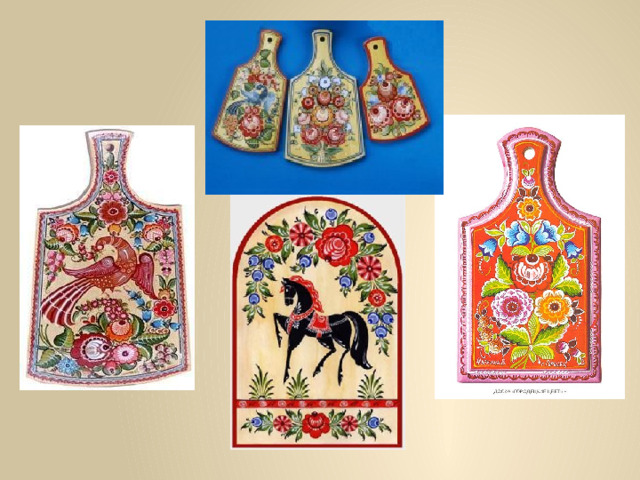Городецкая роспись возникла в городе Городец Нижегородской губернии. Это фантастические цветы, птицы, кони, выполненные масляными красками и украшающие детскую мебель, прялки, посуду, кухонные доски, разного рода сувениры.