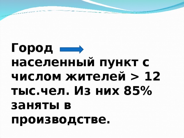 Город населенный пункт с числом жителей 12 тыс.чел. Из них 85% заняты в производстве.