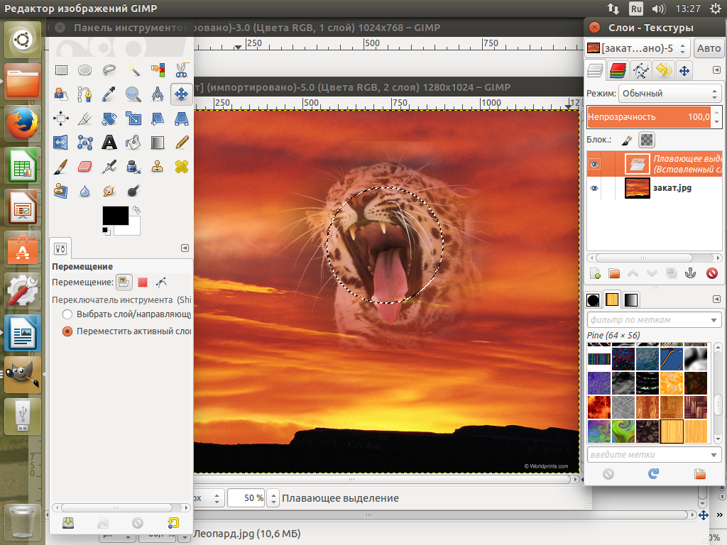 Выбираем инструмент «Перемещение» (ставим галочку в строке Переместить активный слой) и перетаскиваем голову гепарда в удобное для вас место рисунка.