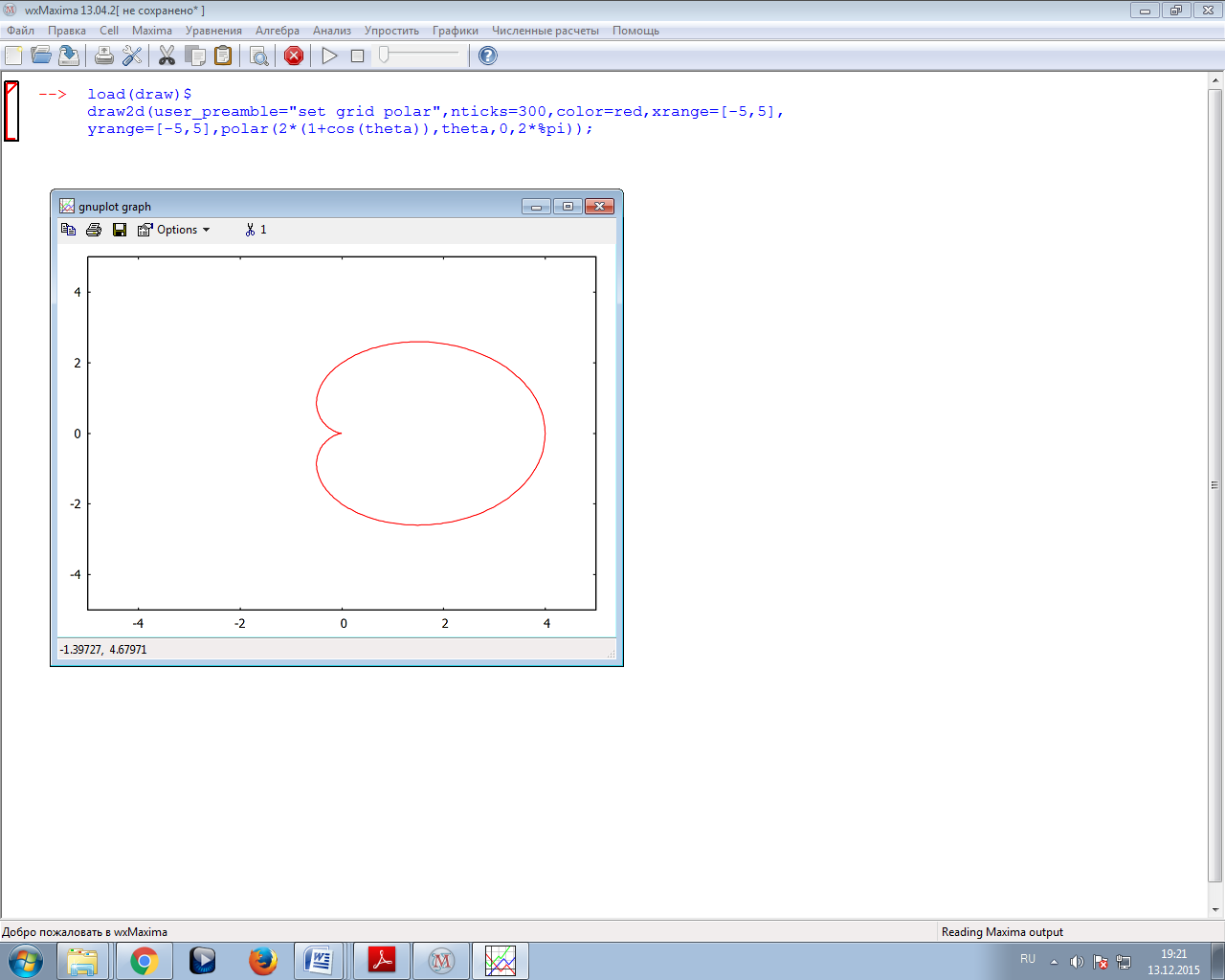 В Maxima графики в полярной системе координат рисует функция draw2d (); но, прежде чем пользоваться этой функцией, нужно дополнительно загрузить этот модуль оператором load(draw).Подробное описание дополнительных опций пакета приведено в приложение А.
