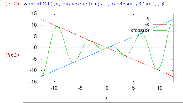 Возможные форматы: встроенный – график нарисуется в том же окне, что и командная строка; gnuplot – график нарисуется в отдельном окне, и его можно масштабировать (изменять размеры за счет изменения размеров окна), причем при движении мышки внизу слева отображаются координаты положения указателя; openmath – в этом формате график может видоизменяться в интерактивном режиме, в частности его можно масштабировать не только за счет изменения размеров окна, но и с помощью кнопок; по-умолчанию – построением графиков занимается gnuplot.