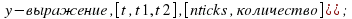 где x – выражение и y – выражение задают зависимость вида x=x(t), y=y(t), где t – переменная параметризации; [t, t1, t2] задает отрезок, в пределах которого параметр t будет изменяться; nticks задает количество кусочков, на которые будет разбит интервал изменения параметра при построении графика.