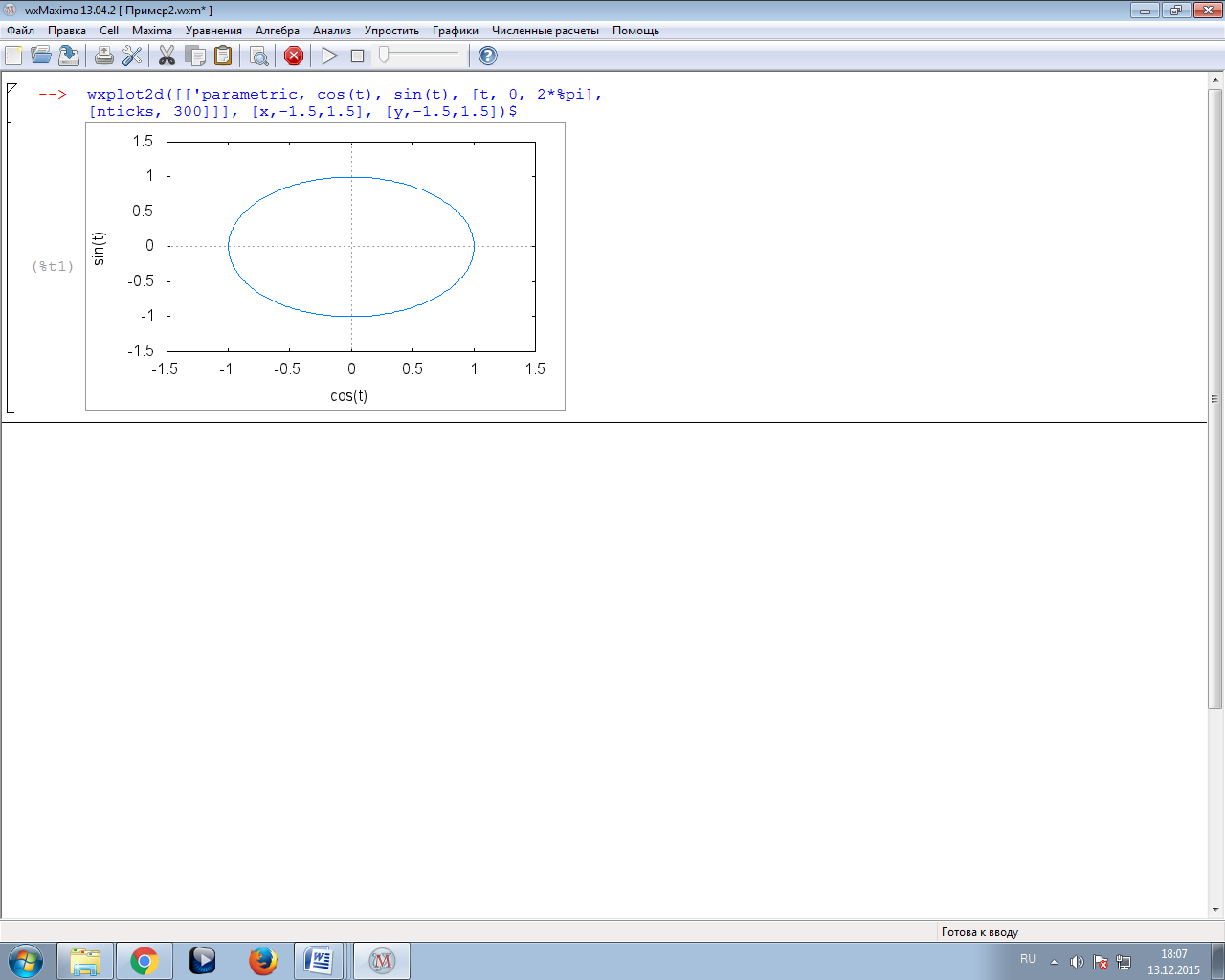 Пример 2. Построить окружность единичного радиуса для функции, заданной параметрически: