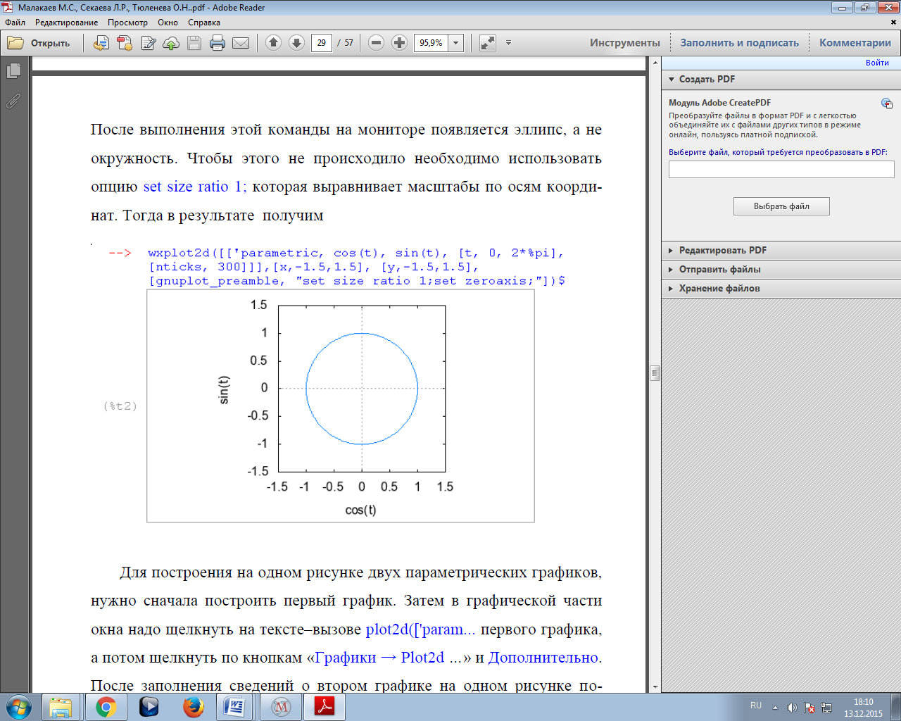 Для удобства набора команды достаточно заполнить две формы: после щелчка по кнопке «Графики → Plot2d …» появляется окно диалога Двумерный график, затем нажимаем на кнопку Дополнительно, на этой форме появляется второе окно Параметрический график [19].