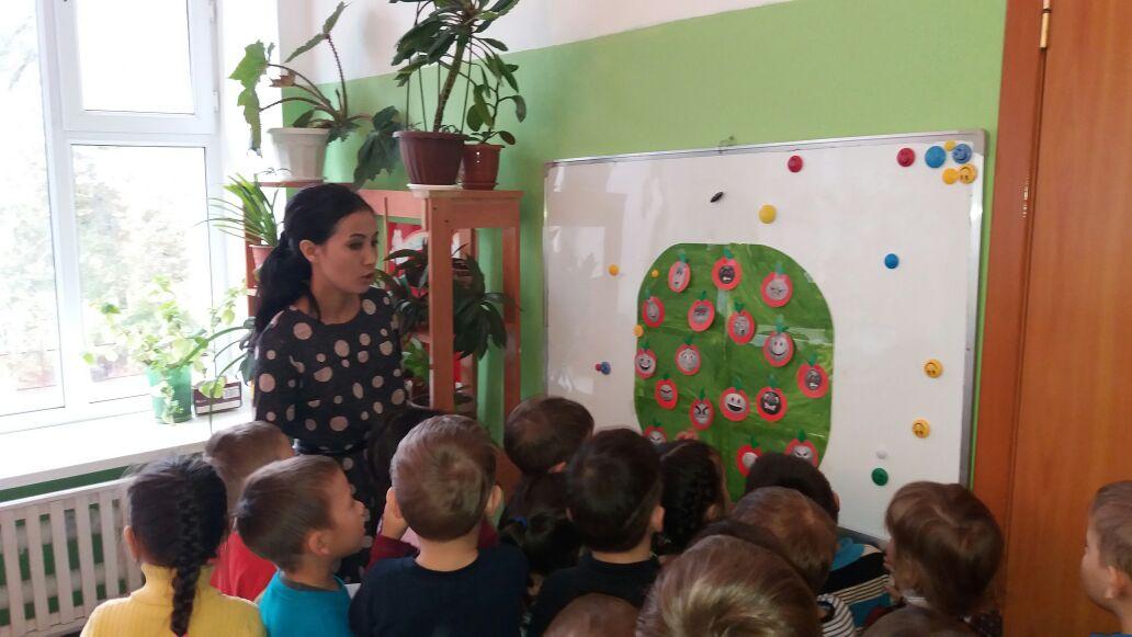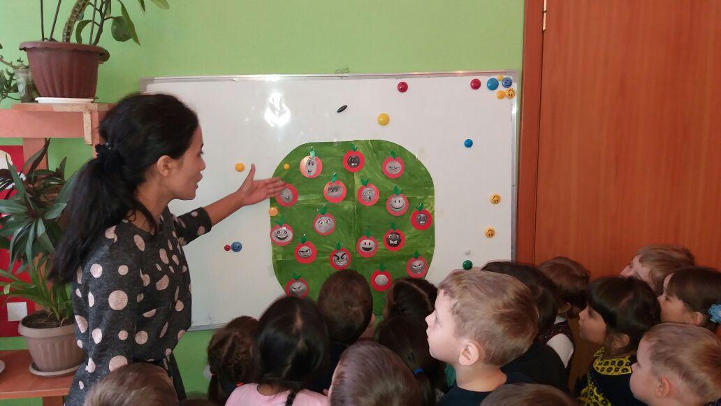 Ребята, как тяжело нашей яблоньке. Как вы думаете почему? Потому что на ней висят помимо радостных яблочек злые и грустные. Поможем яблоньке освободиться от плохих, негативных эмоций? (Дети показывают эмоции)