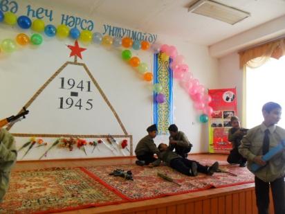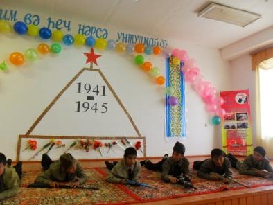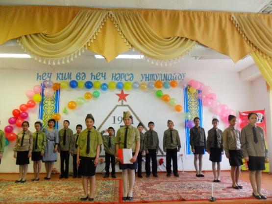Токаева Азиза: Әссаламу әләйкүм һөрмәтлик устазлар, оқуғучилар вә меһ-ман-лар! Улуқ ғалибийәтниң 70 - жиллиғи һарписида жай - жайлиридикидәк бизниң Ақтам жутидиму Улуқ Вәтән урушиниң ғалибийәт билән аяқлашқи-ниға 70 жил тошуши мунасивити бн мәктивимиздә һәр түрлүк иш чариләр өткүзүлүп келиватиду. Мана бүгүн 7ә синип оқуғучилири тәрипидин тайяр-ланған "Һеч ким вә һеч нәрсә унтулмайду " намлиқ очуқ тәрбийә саатимизни башлаштан бурун биз үчүн өз женини хатәргә қоюп, қурван болған, бизгә течлиқ һәдийә қилған, амма лекин һазир аримизда йоқ бовилиримизни әсләп, һәммимиз орнимиздин туруп, уларни әскә елиш үчүн бир минутлиқ сүкинат елан қилимиз.