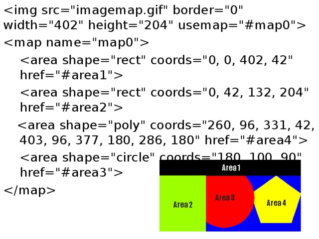 Атрибуты тега area: shape ="circle"/ "rect“/“poly"