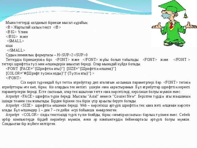 Атрибут сіздің текстіңізді түрлі түске бояйды, бірақ «кемпірқосақтың» барлық түсімен емес. Себебі әрбір компьютерде бірдей көрінбеуі мүмкін, яғни әр компьютердің бейнекартасы әртүрлі болуы мүмкін. Сондықтан бір жүйеге келтірген.