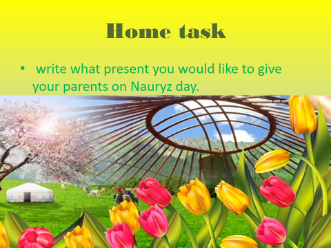 Home task explanation. Your home task is to write what present you would like to give your parents on Nauryz day. Slide 22.