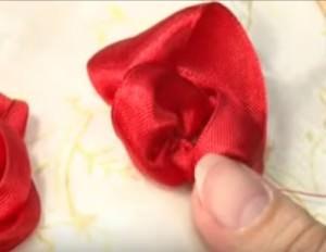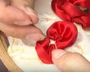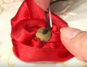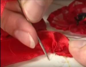 Лепестки необходимо расправить, и закрепить рабочей красной нитью при помощи стежков.
