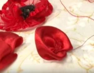 Пришивая оба лепестка, надо следить за тем, чтобы середина цветка оставалась свободной. Для придания большей естественности цветку мака,ленту нужно слегка перекрутить, и оставить достаточно свободной. Когда внешние лепестки готовы, их также нужно зафиксировать нитью.