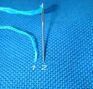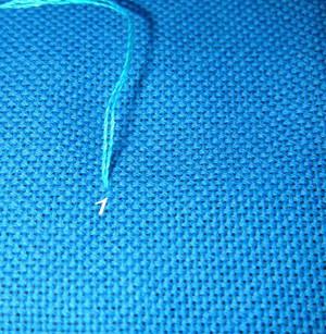 1. Выводим иголку с изнанки на лицо (прокол 1):
