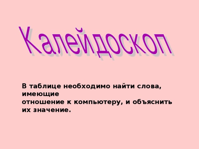 Зашифрованные слова: плата, кабель, клавиатура, компьютер, монитор, дискета, модем, мышь, процессор, сканер, микросхема, дилер, утилита