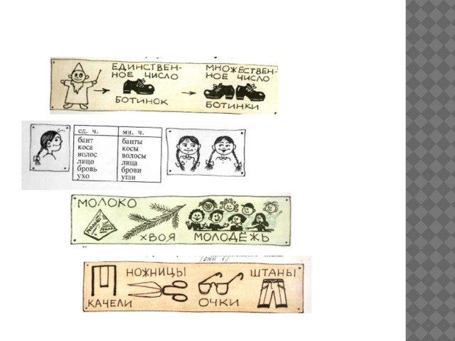 4.Назови существительные, которые употребляются в форме только ед.ч.; только мн. ч.