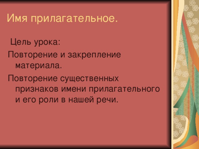 Повторение существенных признаков имени прилагательного и его роли в нашей речи.