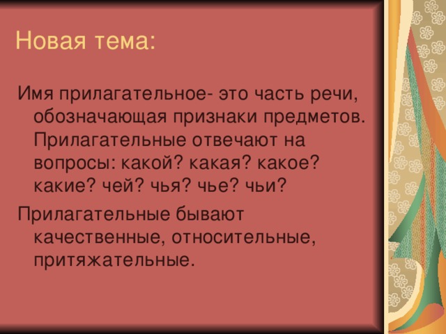 Имя прилагательное- это часть речи, обозначающая признаки предметов. Прилагательные отвечают на вопросы: какой? какая? какое? какие? чей? чья? чье? чьи?
