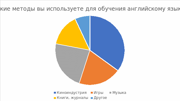 Наиболее популярным методом изучения английского языка среди опрошенных является изучение путем просмотра кинофильмов, что составляет …%, следующими по популярности методами являются музыка, …%, игры, …%, книги и журналы, ….%.