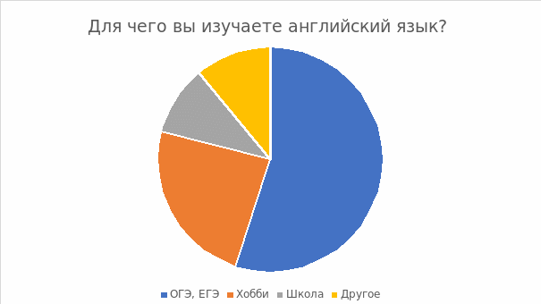 аиболее популярным ответом на вопрос «Для чего вы изучаете английский язык?» является «для подготовки к ОГЭ, ЕГЭ», что составляет …% , для …% опрошенных изучение английского языка –это хобби, ..% изучают его только в рамках школьной программы.