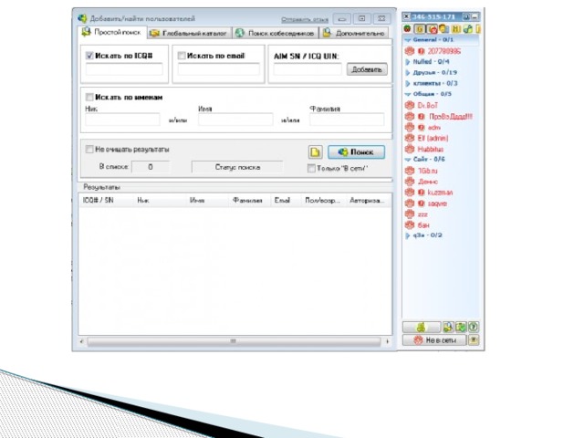 Система интерактивного общения ICQ интегрирует различные формы общения: электронную почту, обмен текстовыми сообщениями (chat), Интернет-телефонию, передачу файлов, поиск в сети людей и т. д.