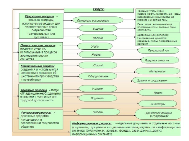 Традиционными видами общественных ресурсов являются материальные (сырьё, материалы, топливо, энергия), природные (полезные ископаемые, водные, лесные), энергетические (уголь, нефть, природный газ), трудовые (учителя, водители, инженеры, врачи), финансовые ресурсы (налоги, денежные вклады в сбербанках).