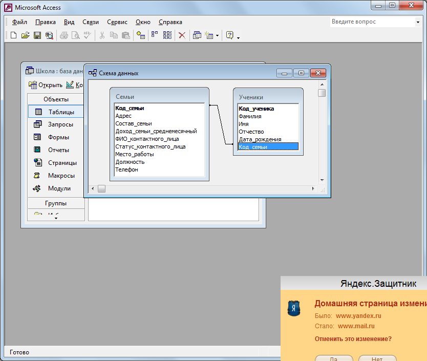 или выполните в меню команду Сервис – Схема данных. Должно открыться окно Схема данных. Одновременно с открытием этого окна открывается диалоговое окно Добавление таблицы. Щелчком на кнопке Добавить выберите таблицы и закройте окно Добавление таблицы.Перетащите мышкой поле Код_Семьи из таблицы СЕМЬИ на поле Код_Семьи таблицы УЧЕНИКИ. При отпускании кнопки мыши автоматически откроется диалоговое окно Изменение связей. В окне Изменение связей убедитесь, что поля для связи выбраны правильно и что между таблицами установлено отношение «один-ко-многим». Щелкните на кнопке Создать.
